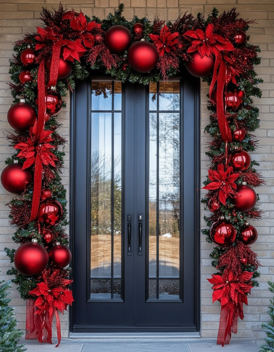 Make a commanding holiday statement with this stunning, traditional red entryway set. This dramatic display features a lush, thick faux pine arched garland designed to beautifully frame your doorway. The greenery is completely covered in opulent decorations, including massive, glossy crimson red baubles, shimmering red textural sprays, and striking oversized velvet red poinsettias. Long, flowing ribbons of sheer and satin red ribbon are integrated throughout, adding movement and high-end visual impact. This set captures the true spirit of classic, festive luxury.