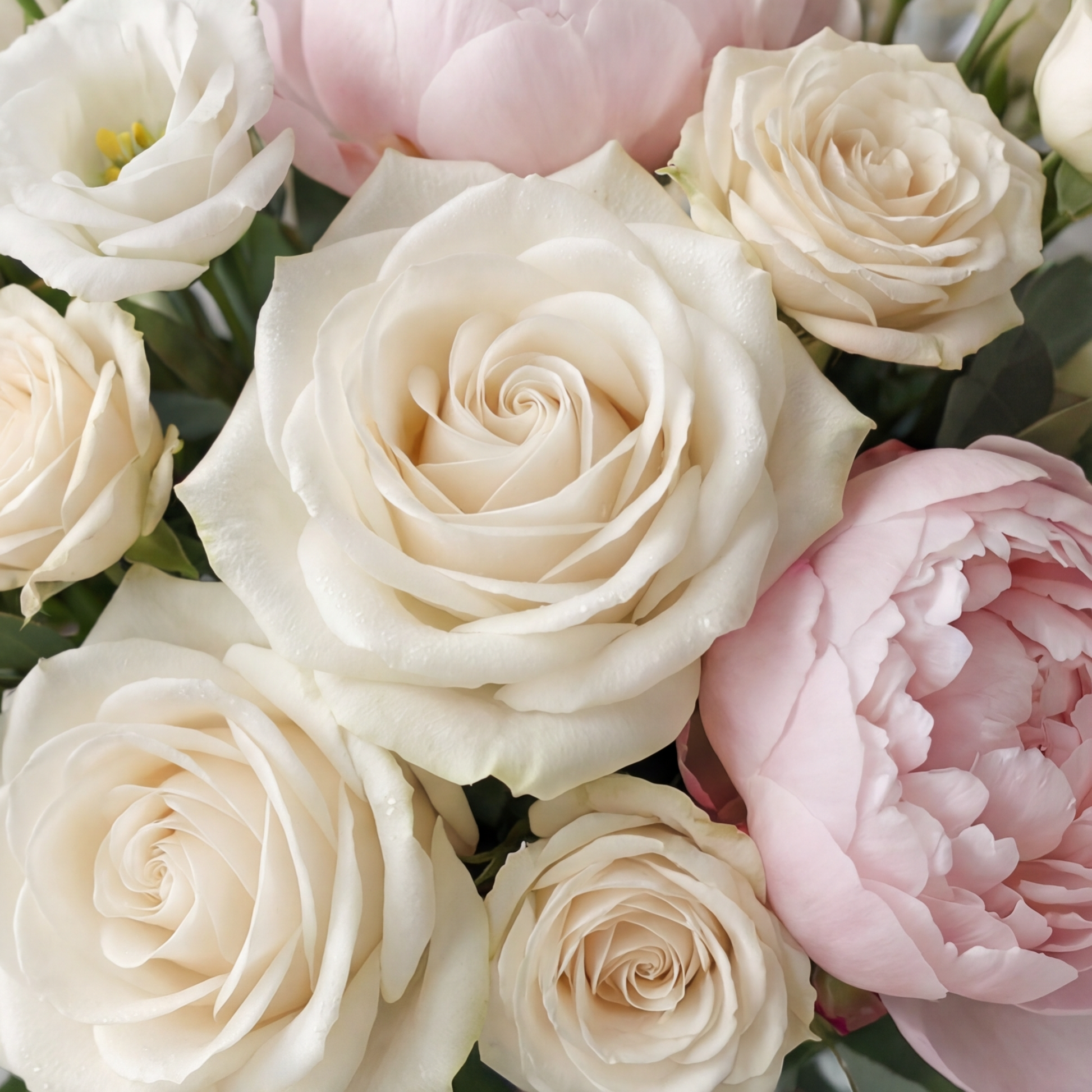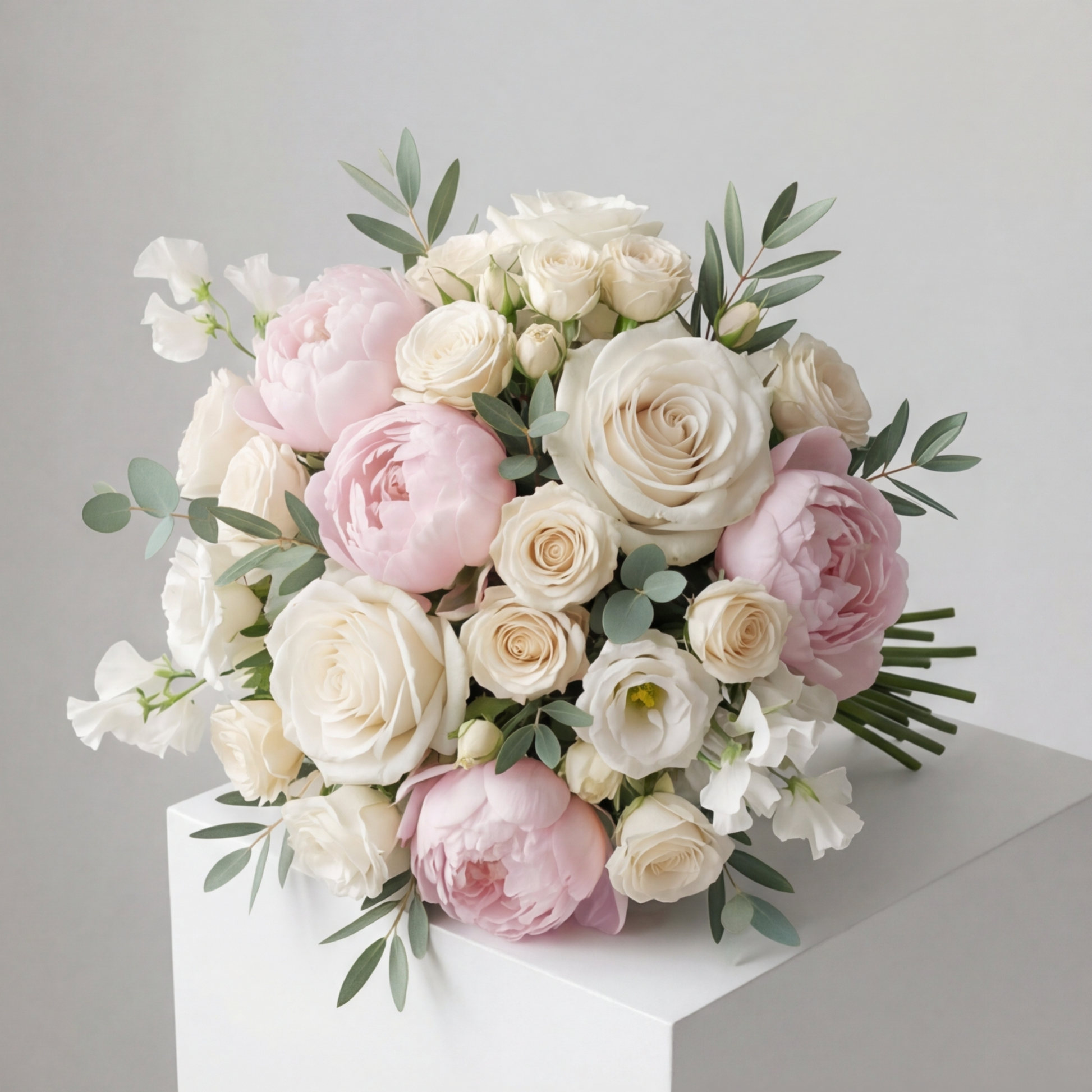 A romantic bouquet of cream roses, blush peonies, lisianthus, and soft foliage—gathered in serenity and tied with a ribbon like a vow at sunrise.