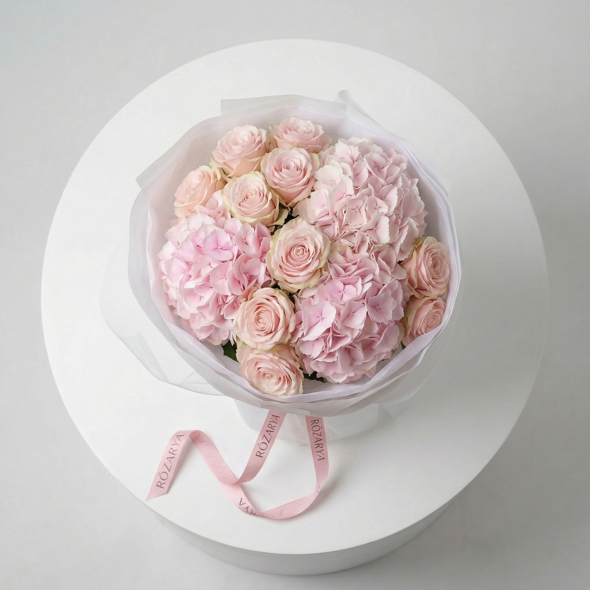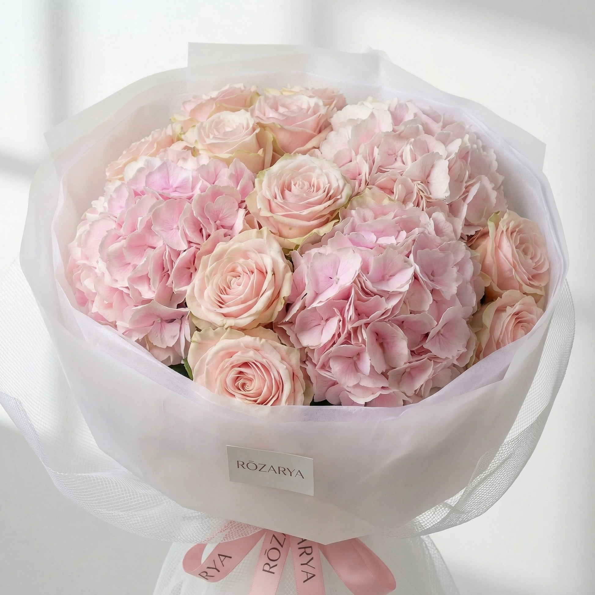 A soft, romantic bouquet featuring pale blush roses nestled into fluffy pink hydrangea clusters, creating a full, cloud-like silhouette. Wrapped in crisp white with an airy tulle finish and tied with the signature Rozarya ribbon for a delicate, couture look.