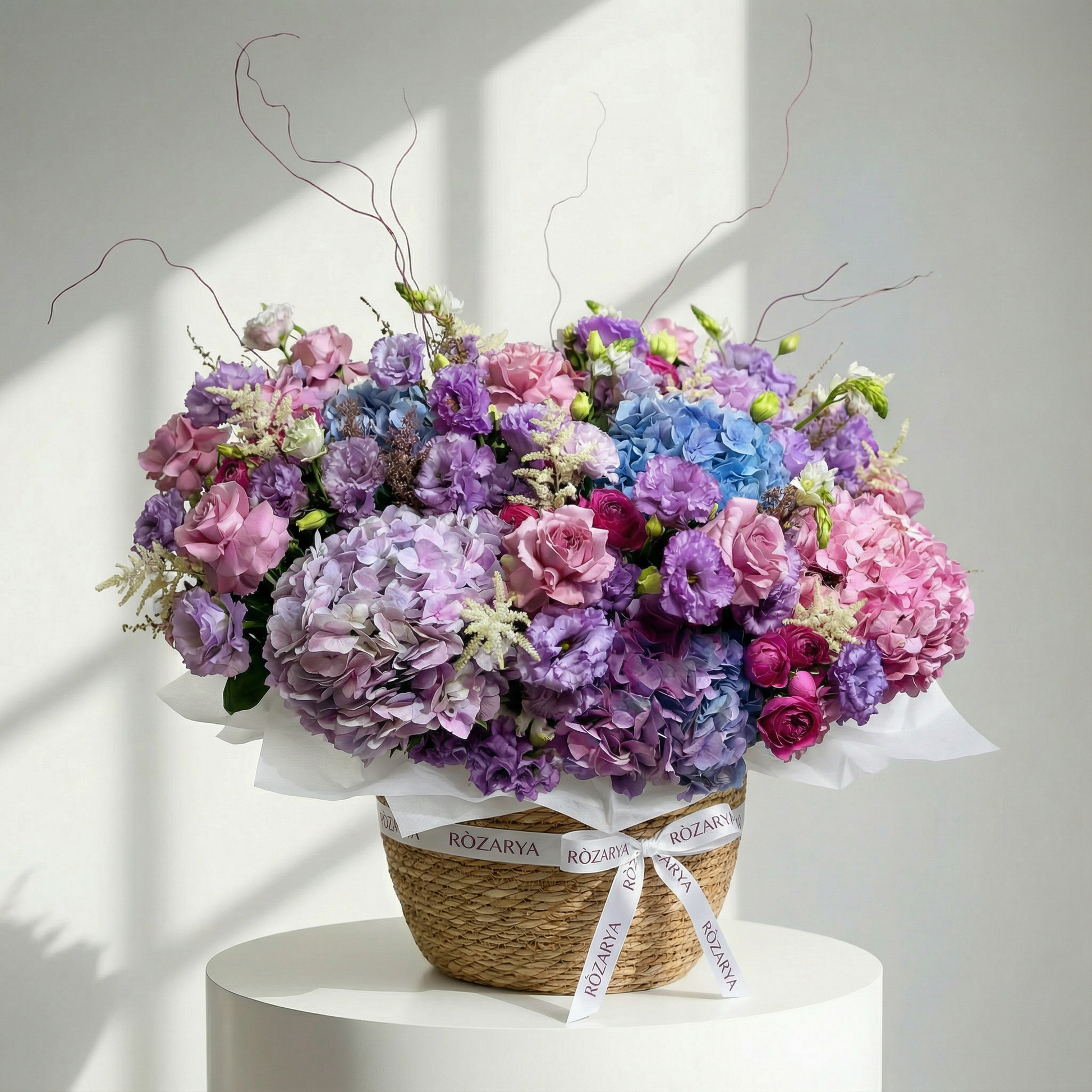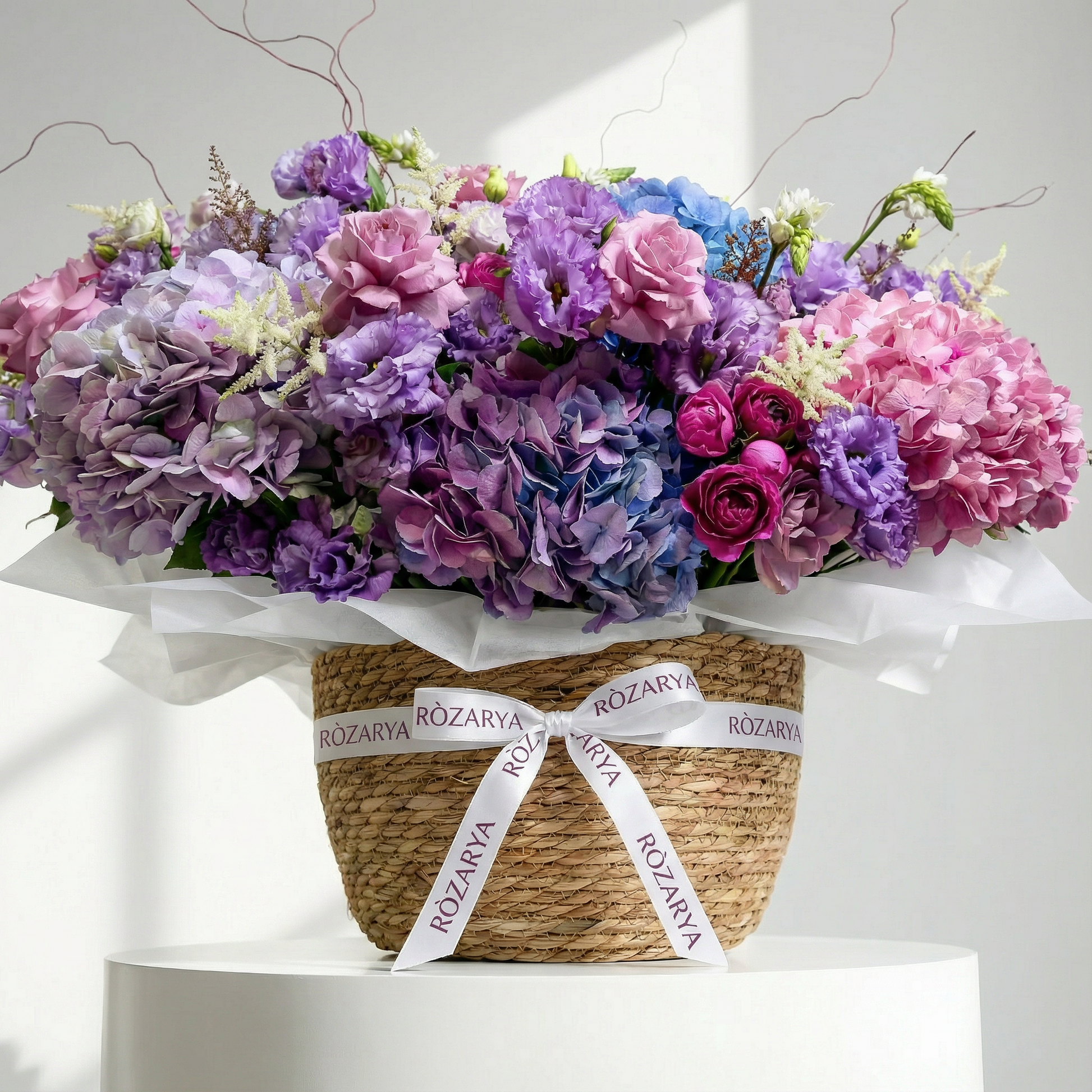 An exceptionally large, high-impact arrangement overflowing with premium, dense blooms like Hydrangea and Roses, set in a hand-finished rope-wrapped basket or vase.