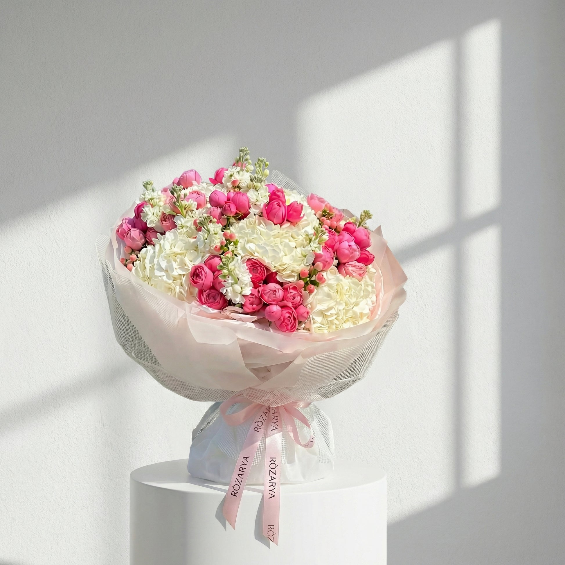 A lush, airy bouquet of creamy white hydrangeas layered with vibrant pink roses, finished with delicate white blooms and soft blush wrapping.