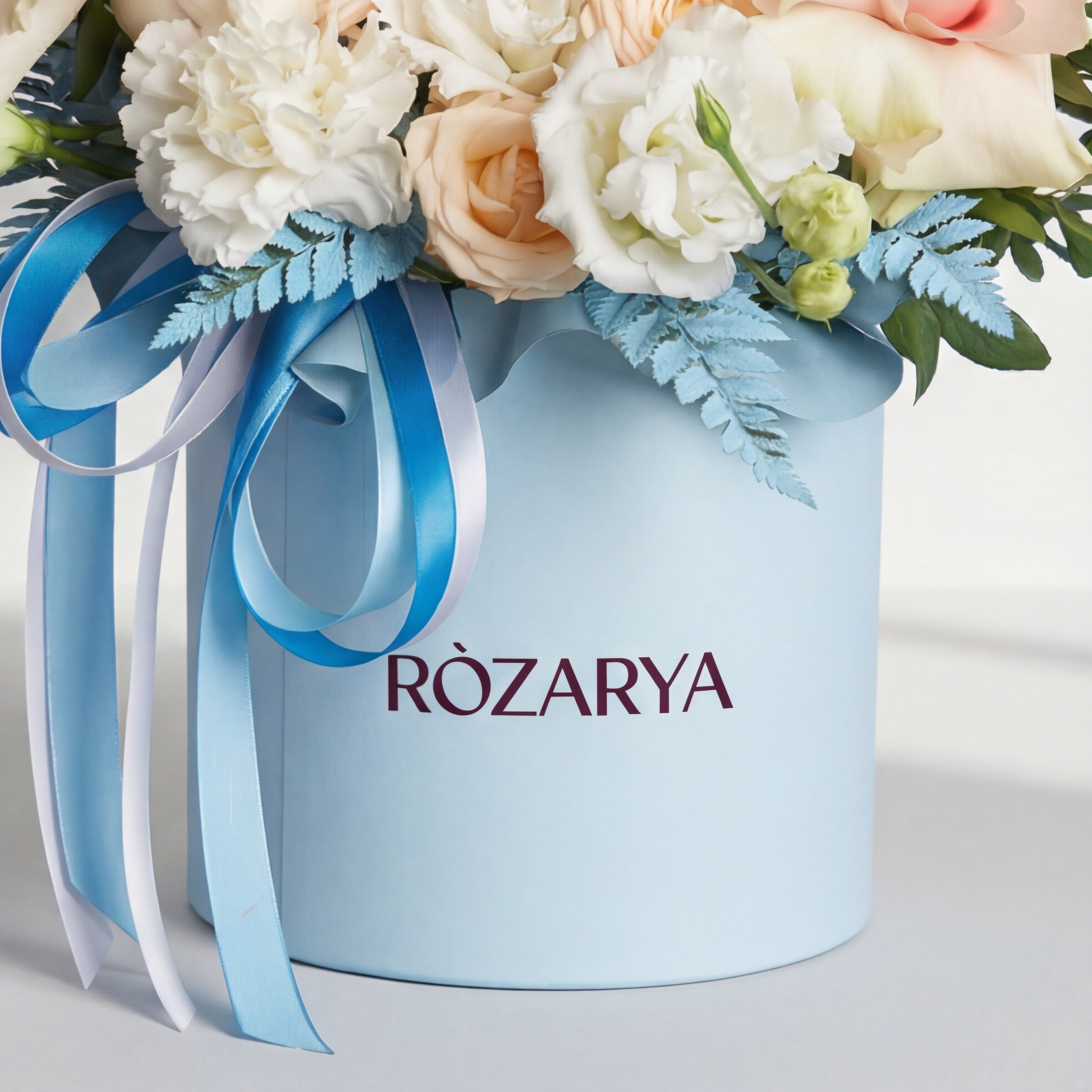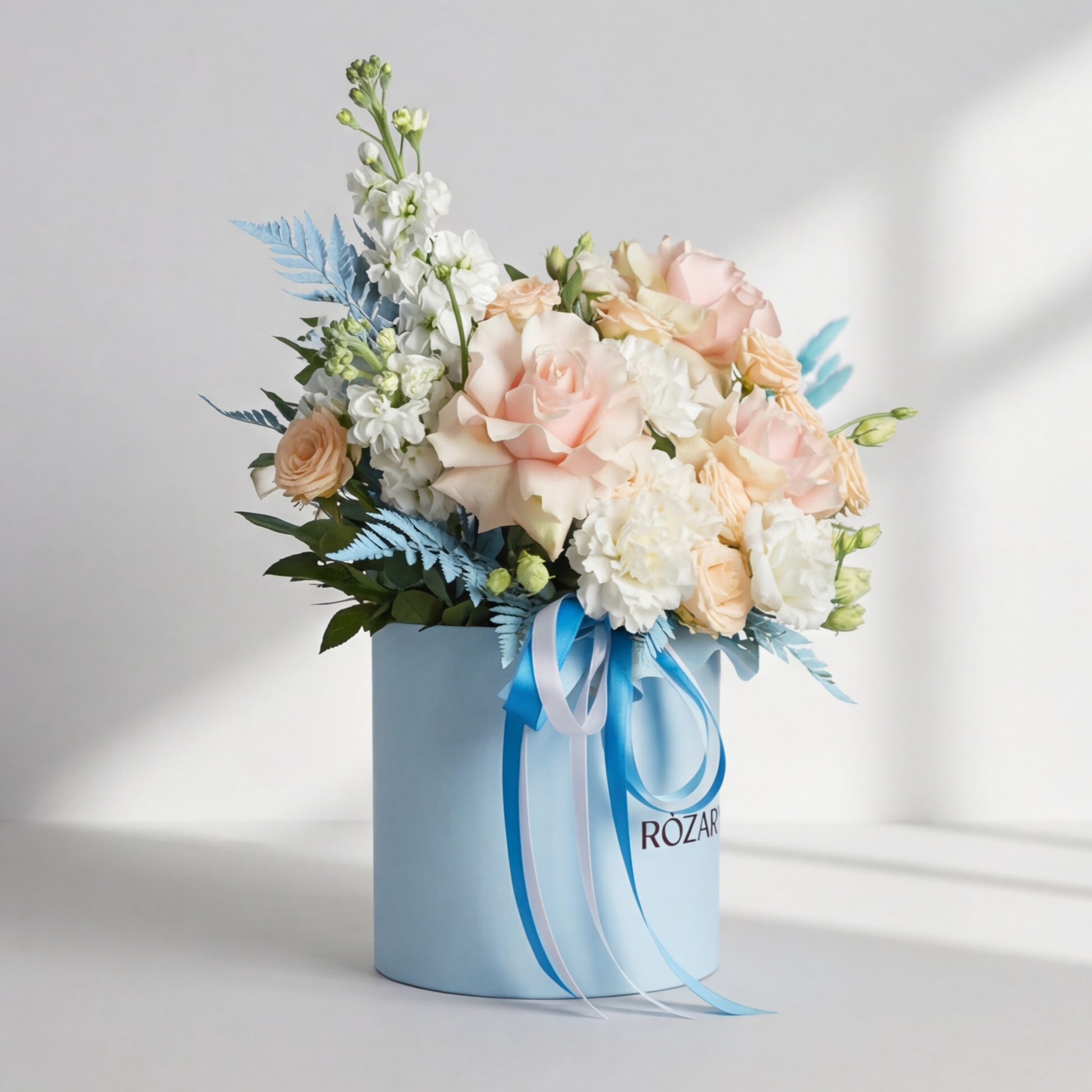 Introducing the Celestial Blush Box, a stunning arrangement that captures the tranquility of a soft morning sky. Features romantic blush roses, creamy peach spray roses, and elegant white carnations, beautifully contrasted with unique, dusty blue fern accents. Housed in a serene powder-blue hatbox and finished with cascading satin ribbons, this piece is the ideal choice for commemorating new beginnings, baby showers (gender neutral or boy), or simply sending a peaceful, heartfelt message.