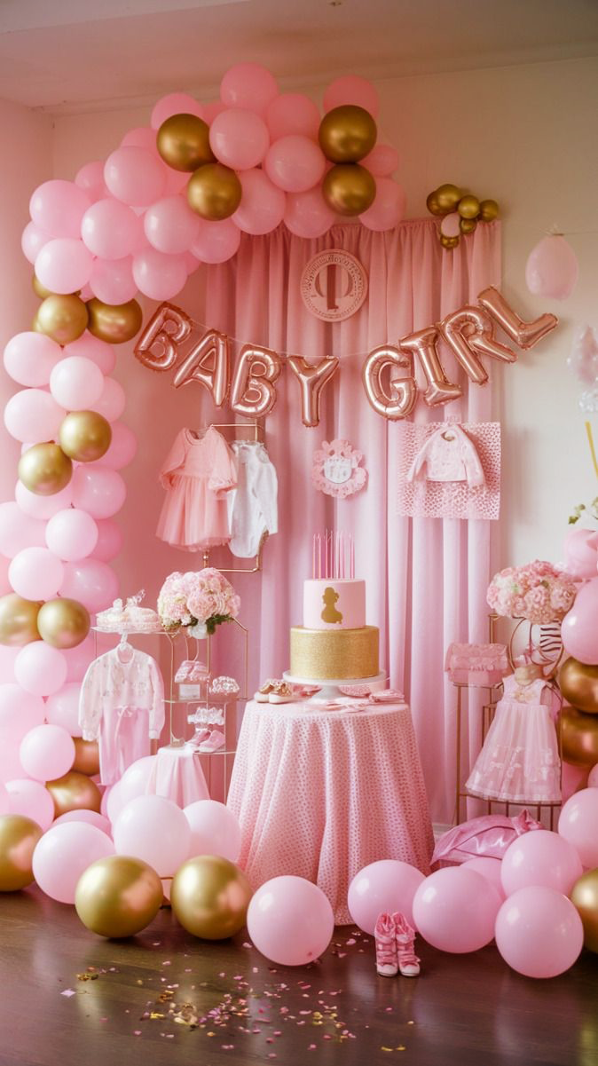 Это роскошное украшение создано в честь рождения девочки и включает в себя роскошную арку из розовых и золотых воздушных шаров, баннер из фольгированных шаров с надписью «МАЛЫШКА» и изысканно оформленную зону для десертов и подарков.