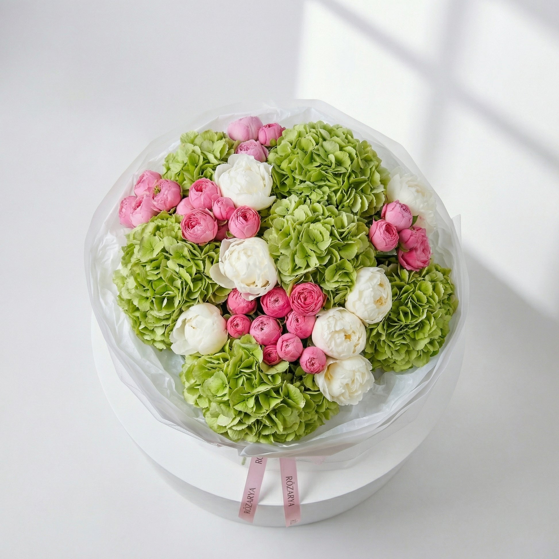 A fresh, playful bouquet featuring crisp green hydrangea clusters paired with creamy white peonies and bright pink ranunculus buds for a vibrant, modern contrast. Wrapped in clean white with a soft tulle finish and tied with the signature Rozarya ribbon.